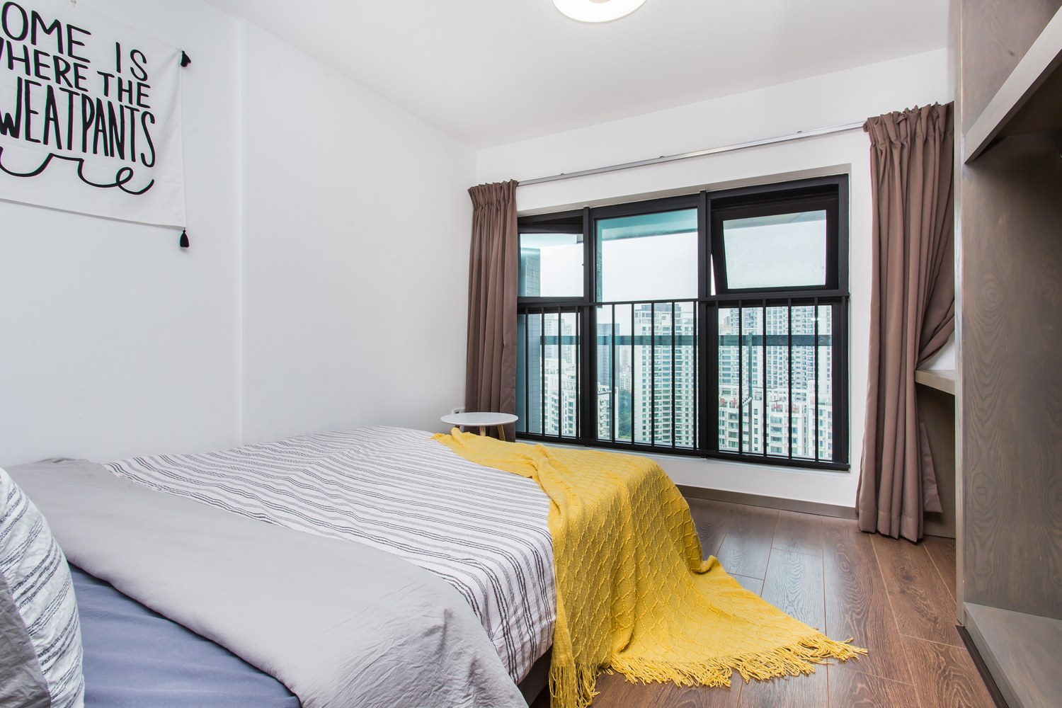 入住过程中请勿使用晾晒的四件套,以免影响后续的客人入住。谢谢您的配合,如果影响了您的晾晒或者您觉得不美观,四件套干了后您可以把四件套收到楼上卧室的壁柜里面